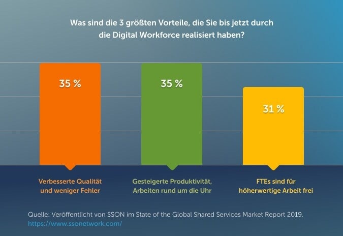 Die Automatisierung sich wiederholender Aufgaben hilft Shared Services dabei, die Effizienz zu steigern, Kosten zu senken und die Kontrolle in den Bereichen Finanzen, Personalwesen und Betrieb zu verbessern.